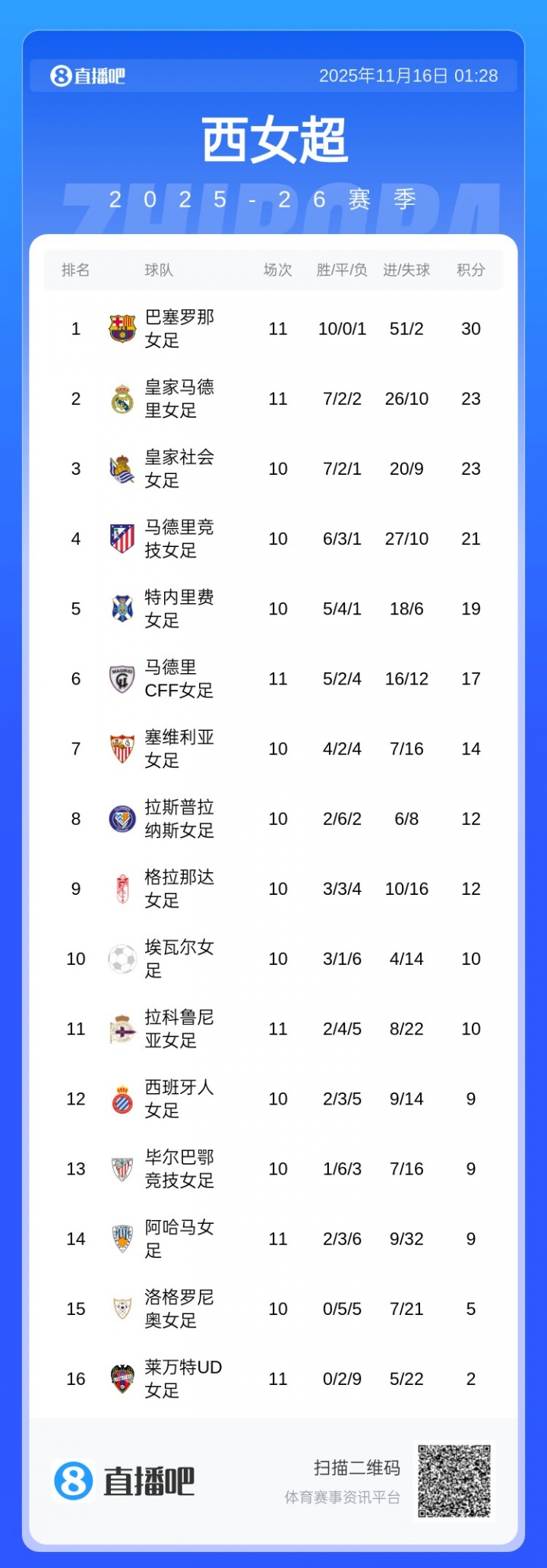 本场比赛后,巴萨女足11轮10胜1负,积30分领跑西女超积分榜。